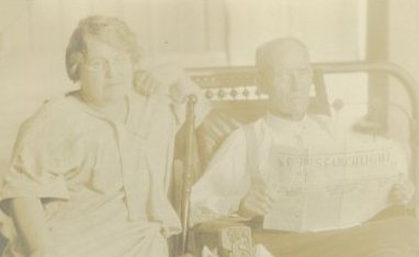 Under the photograph are the words: "The Searchlight, Vol VIII, Apr. 24" which appears to be the newspaper being held. |