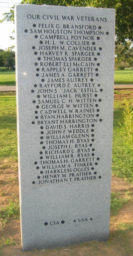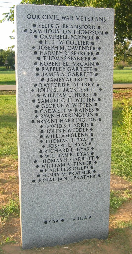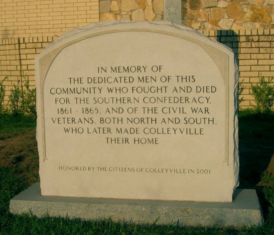 This memorial project identifies both Union and Confederate veterans of the Civil War who lived, owned property, were active members of a church, or were buried within a four mile radius, centered on Pleasant Run Baptist Church in Colleyville, Texas. This monument to their memory is being erected at the church. It takes the form of three upright granite tablets engraved with names on both sides, along with an upright marble dedicatory stone explaining the markers. When you are passing by Pleasant Run Baptist Church, please take a moment to stop and see what weve done. The first tablet includes the names of several area pioneers for whom streets and communities are named, including Dr. Lilburn H. Colley, William L. Hurst, Felix G. Bransford, Harvey R. Sparger, and many others. My collaborators in this project are my mother, Doris Jo Patterson, and Jimmy Reynolds, a lifelong friend. The three of us have lived a total of more than one hundred fifty years in this community, and we are deeply interested in preserving its past. My mothers family settled in Colleyville in 1879, and the Reynoldses arrived in 1902. Civil War Veterans of Northeast Tarrant County (Biographies) Community Civil War Veterans Memorial Website