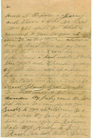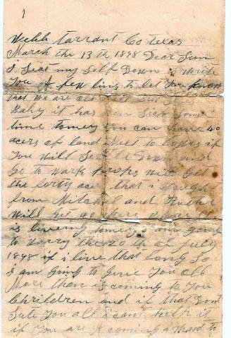 This letter was written by my husband's grandfather, William M Reed, in 1898. His first wife had died and he was advising his son he was remarrying. His new wife was a daughter of John J. Watson. The Watson's were early settlers in Tarrant County. John J. Watson's first wife, mother of the new Mrs. Reed, was Mary Louise Elliott, daughter of Richardson M. Elliott, another early settler. |