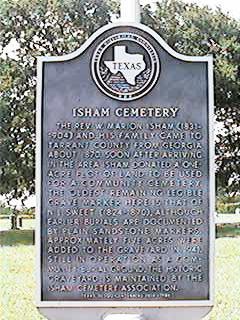 Isham Cemetery The Rev. W. Marion Isham (1831-1904) and his family came to Tarrant County from Georgia about 1870. Soon after arriving in the area Isham donated a one-acre plot of land to be used for a community cemetery. The oldest remaining legible grave marker here is that of N.L. Sweet (1824-1870), although earlier burials are documented by plain sandstone markers. Approximately five acres were added to the graveyard in 1941. Still in operation as a community burial ground, the historic graveyard is maintained by the Isham Cemetery Association. Texas Sesquicentennial 1836-1986.