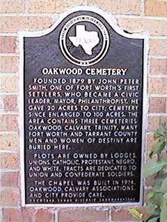 John Peter Smith, Founder of Oakwood Cemetery Pioneer area settler John Peter Smith (1831-1901), who donated twenty acres for the establishment of this cemetery, came to Fort Worth from Kentucky in 1853. He served the community as a teacher, clerk, surveyor, and attorney, and became a noted civic leader. Although opposed to the secession of Texas during the Civil War, Smith raised a company of Tarrant County men for the Confederacy and joined Sibley's Brigade in 1861. While in the war he served in the unsuccessful invasion of New Mexico, the recapture of Galveston in 1863, and was severely wounded at Donaldsville, Louisiana, later that year. After the war Smith returned to Fort Worth, where be became involved in the development of the city. He helped organize a bank, gas light company,and street railway. He also gave land for city parks, cemeteries, including this site in 1879, and a hospital, later named in his honor. In 1882 he became Mayor and directed the establishment of many public services, such as the school system and the water department. In 1901 Smith died in St. Louis, Missouri, while on a promotional trip for Fort Worth. He is buried in a section of Oakwood Cemetery that is part of the original acreage he donated to the city. |
