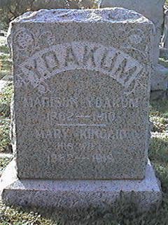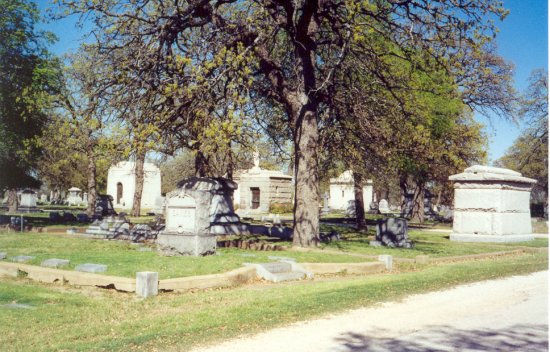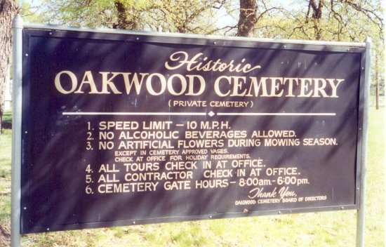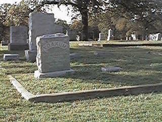 Looking east from the statue, Soldier's Row contains 3 rows of graves between two curbs, and extends to near where the pickup is parked in the background. To the right is Calvary Cemetery. To the left is the oldest section of Oakwood. See the Oakwood Cemetery Block Map to locate. |