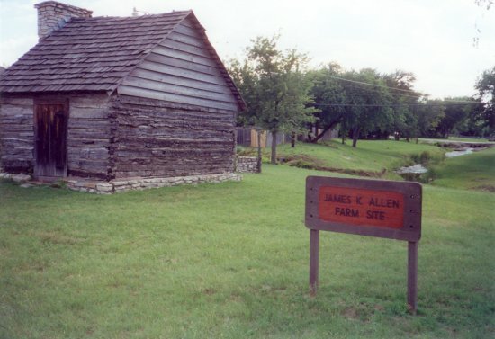 Since these photos were taken, the William Terry Allen Log Cabin and historical marker have been moved to the grounds of the White Settlement Historical Museum, 8320 Hanon Drive, White Settlement, Texas 76108-2317, phone 817-246-9719. update courtesy of Carol L. Davis, Museum Manager |